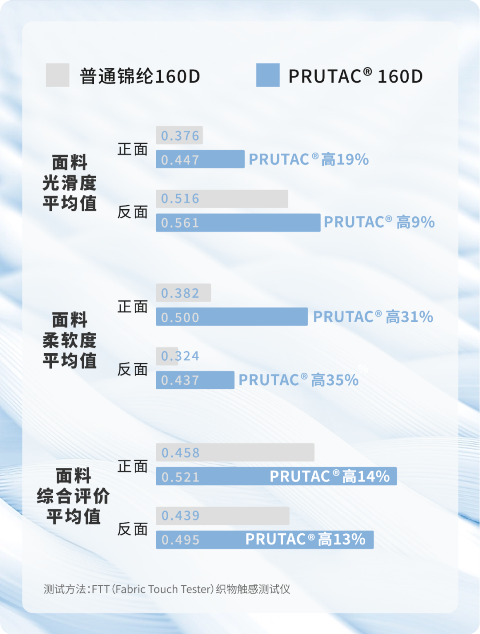 根據(jù)FZ/T 01166-2022《紡織品織物觸感檢測與評價方法:多指標(biāo)集成法》測試標(biāo)準(zhǔn),錦綸66 PRUTAC?織物光滑度和柔軟度明顯優(yōu)于普通錦綸,整體觸感更加舒適。