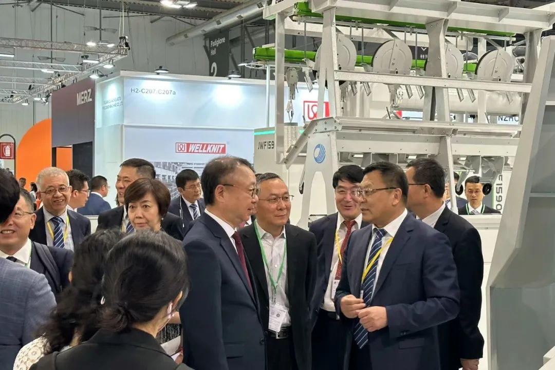 6月10日,代表團(tuán)一行應(yīng)邀參觀了歐洲國際紡織機(jī)械展(ITMA)。期間,孫瑞哲一行走訪了中國恒天、遠(yuǎn)信工業(yè)、三技精密技術(shù)、慈星、歐瑞康、特呂茨勒、圣東尼、意達(dá)、蘭精、村田、必佳樂等企業(yè)展臺(tái);調(diào)研最新紡織品和服裝加工技術(shù)、機(jī)械和材料;見證達(dá)利絲綢(浙江)股份有限公司和瑞士史陶比爾集團(tuán)簽約。中國紡織機(jī)械協(xié)會(huì)會(huì)長顧平、中國國際貿(mào)易促進(jìn)委員會(huì)紡織行業(yè)分會(huì)常務(wù)副會(huì)長梁鵬程等隨同參觀調(diào)研。