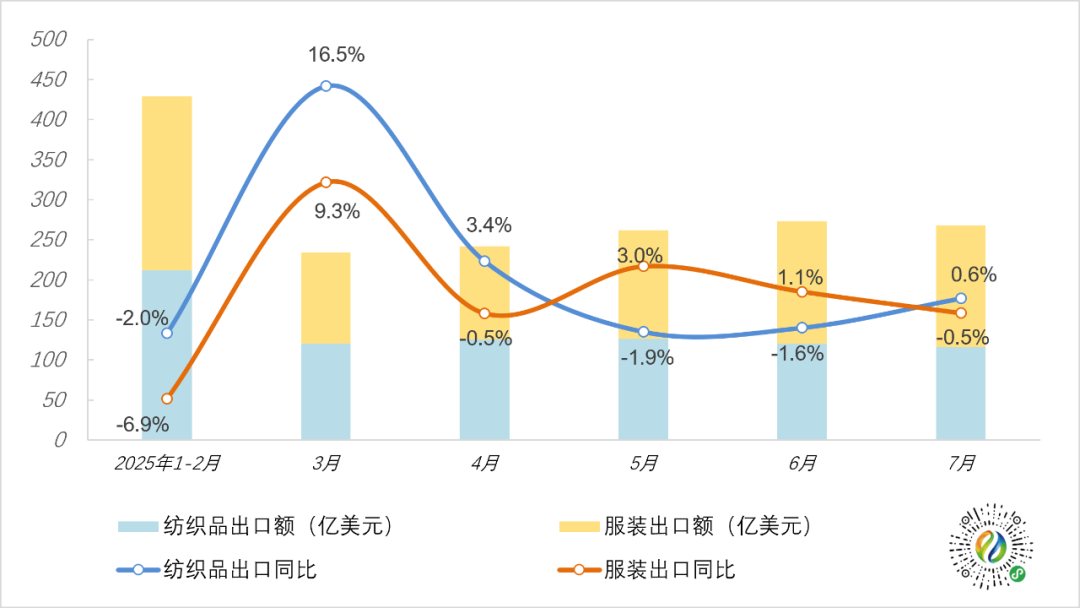 圖1 2025年1~7月全國紡織品、服裝出口月度統(tǒng)計