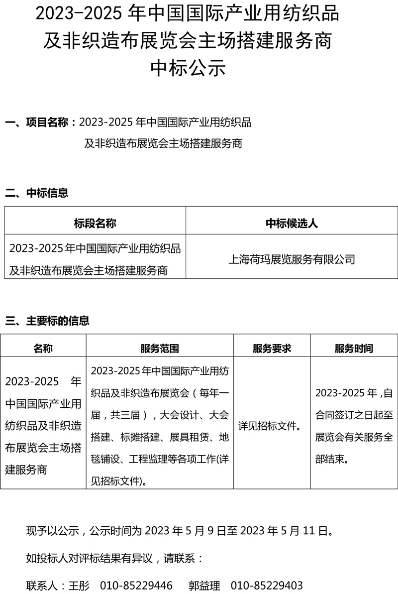 2023-2025年中國國際產(chǎn)業(yè)用紡織品及非織造布展覽會主場搭建服務(wù)商中標(biāo)公示